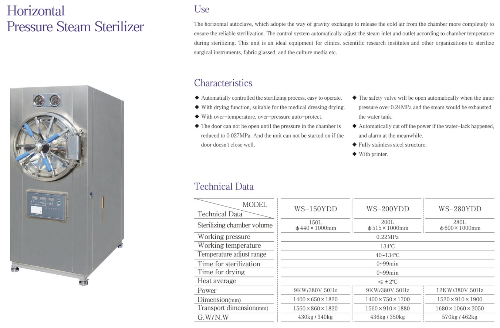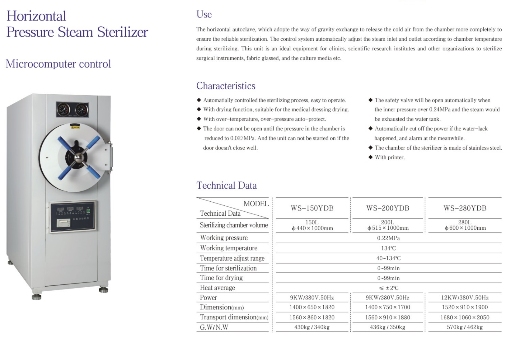 • The sterilization process is automatically controlled, without supervision, and is easy to use.