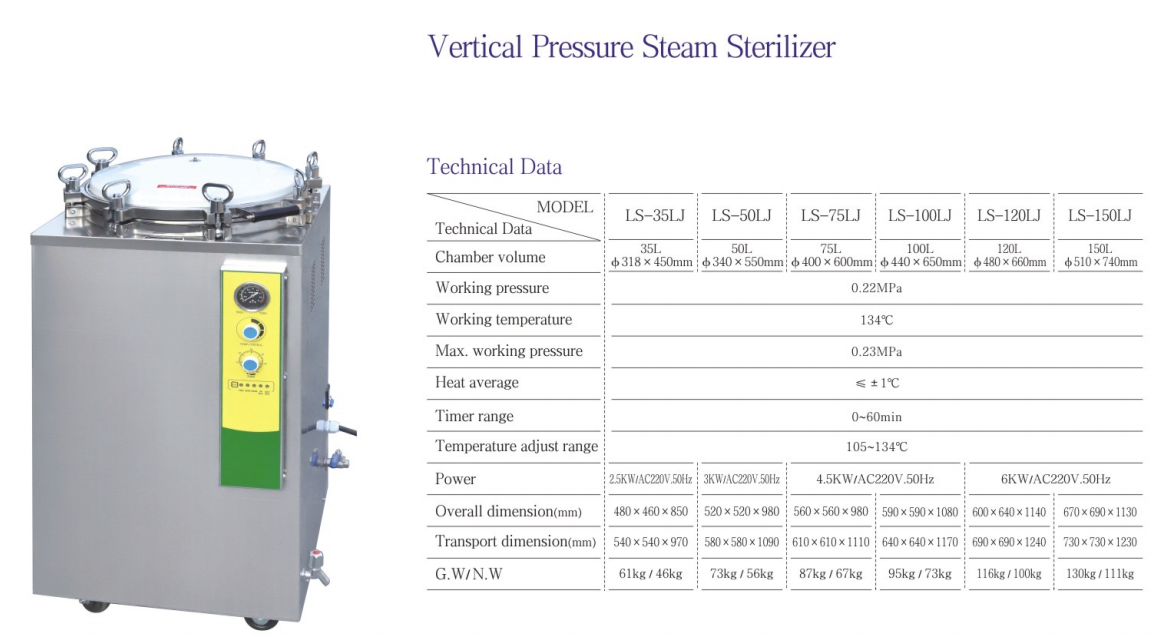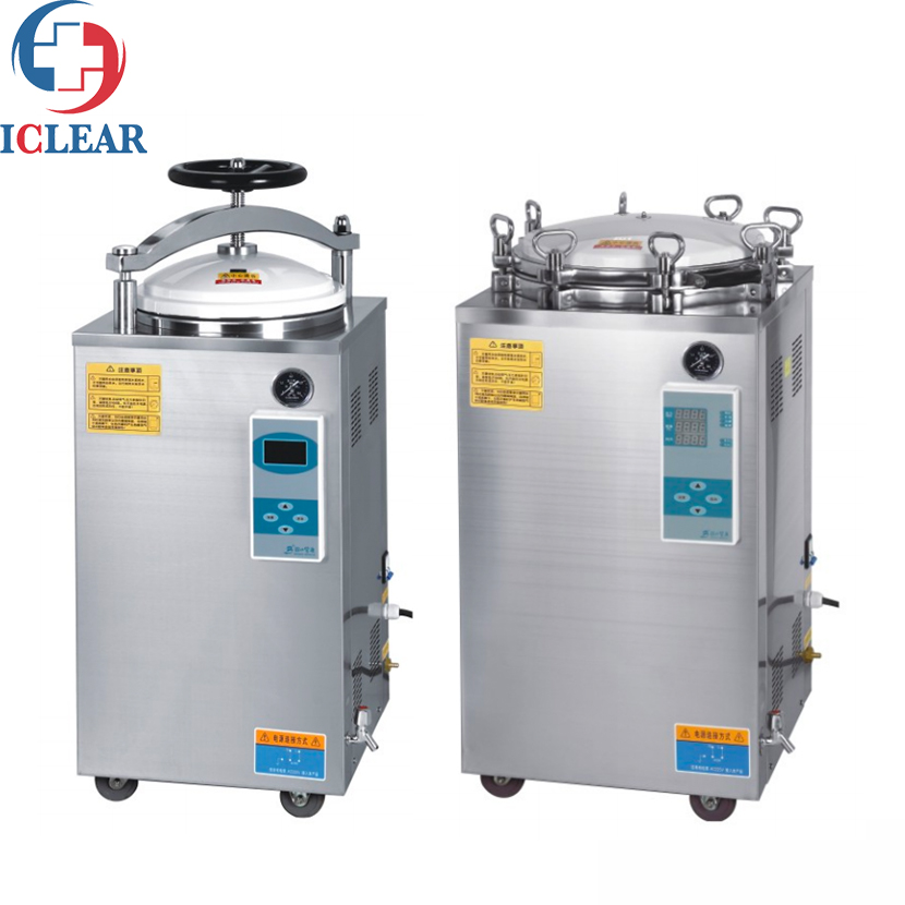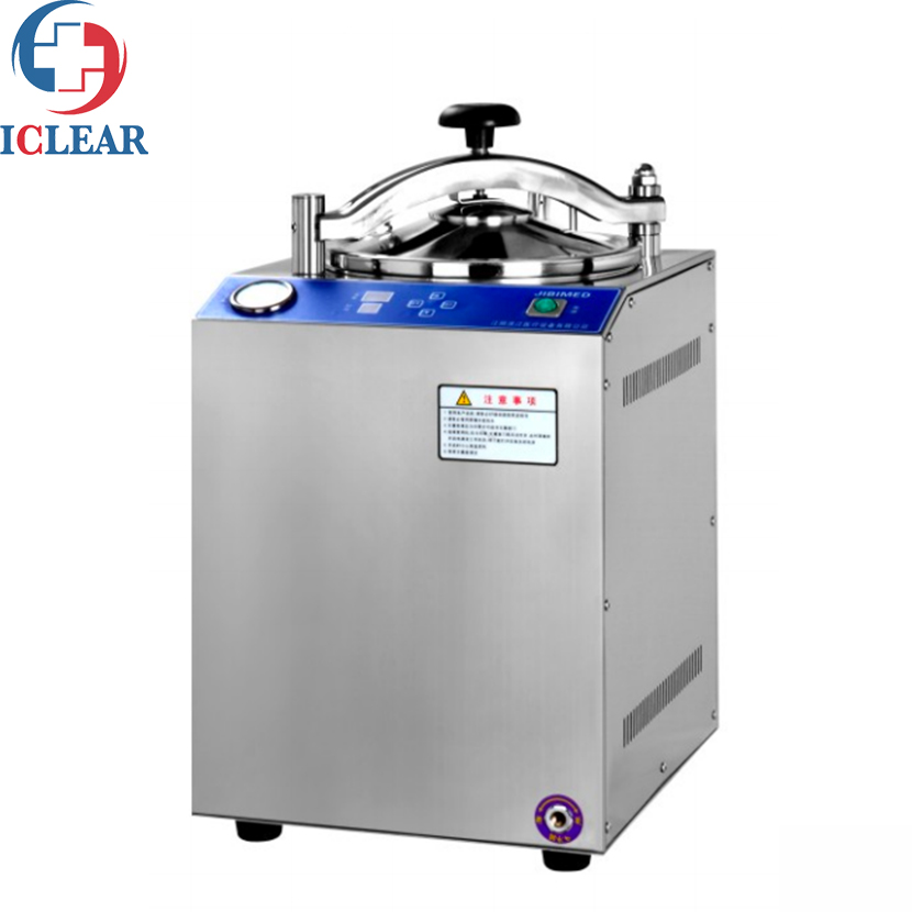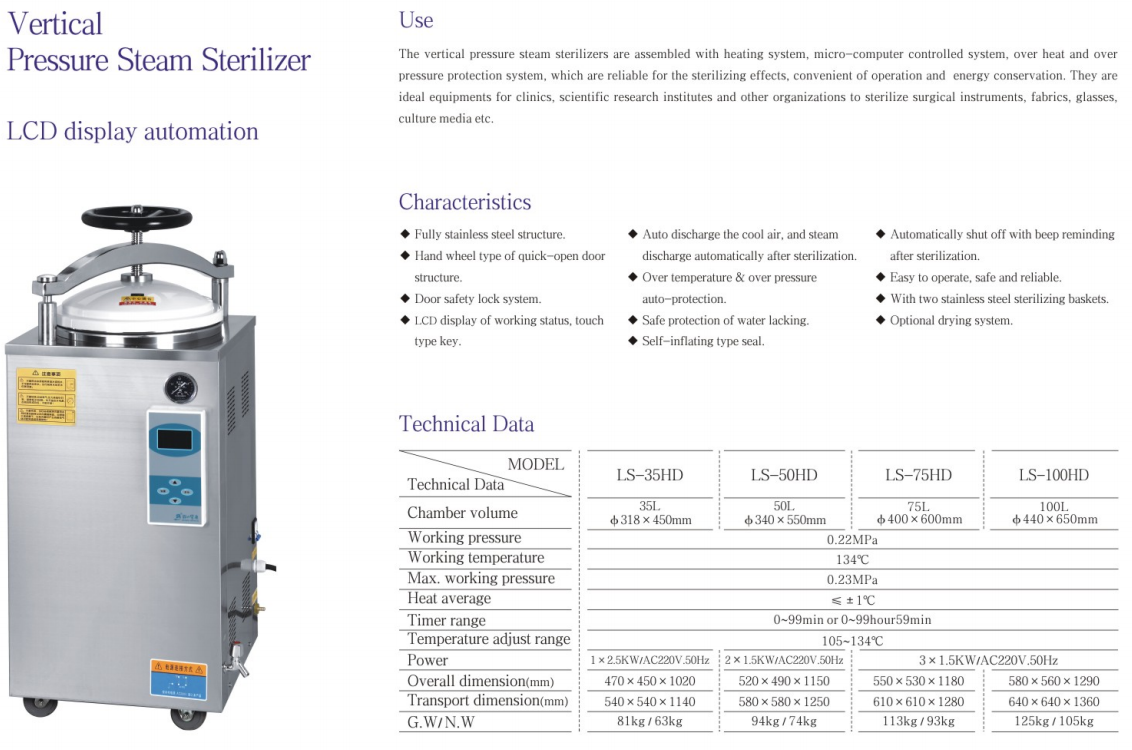 This vertical sterilizer is a safe, reliable and automatically controlled sterilization equipment, consisting of a heating system, a microcomputer control system and an overheating and overpressure protection system. The container has the advantages of reliable disinfection and sterilization effect, convenient operation, safe use, power saving and durability, and low cost.