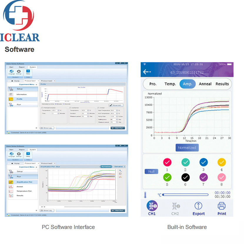CHL-Gene-8C/Gene-8C2 have a 7inch touch screen. Realtime temperature and fluorescence data are displayed graphically and in real-time during a run and all of the data are held in the instrument's large internal Flash memory. These data are permanently stored and can be reviewed at any time after the run has finished or uploadedto a PC or an android mobile via USB link or WIFI.