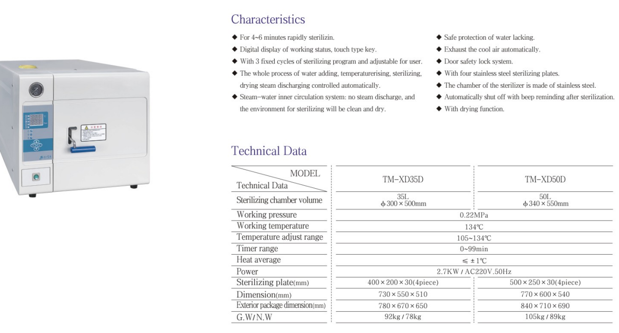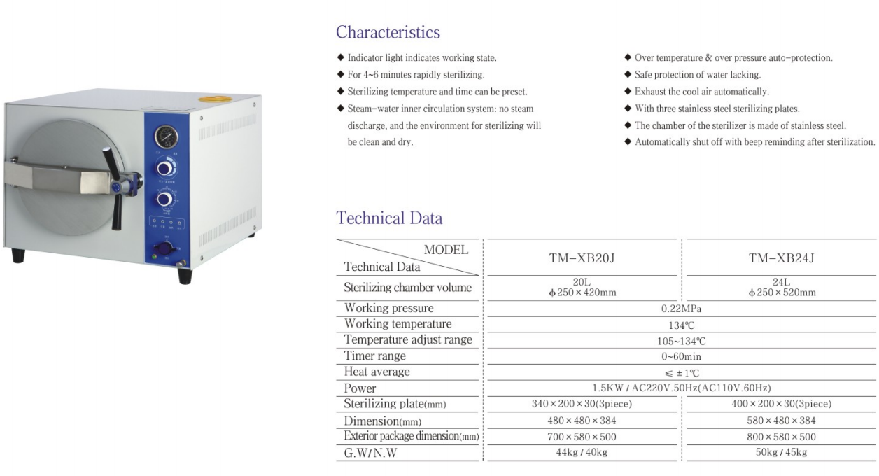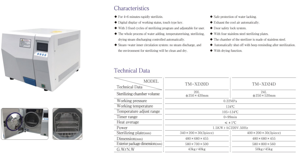 This sterilizer is a safe, reliable and automatically controlled small rapid desktop sterilization equipment, suitable for medical and health, pharmaceutical, scientific research and other units. Provides rapid sterilization of surgical, dental, and ophthalmic instruments, glassware, pharmaceuticals, media and fabric dressings, and foodstuffs that are resistant to saturated steam.