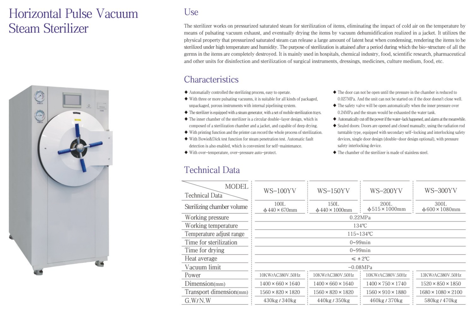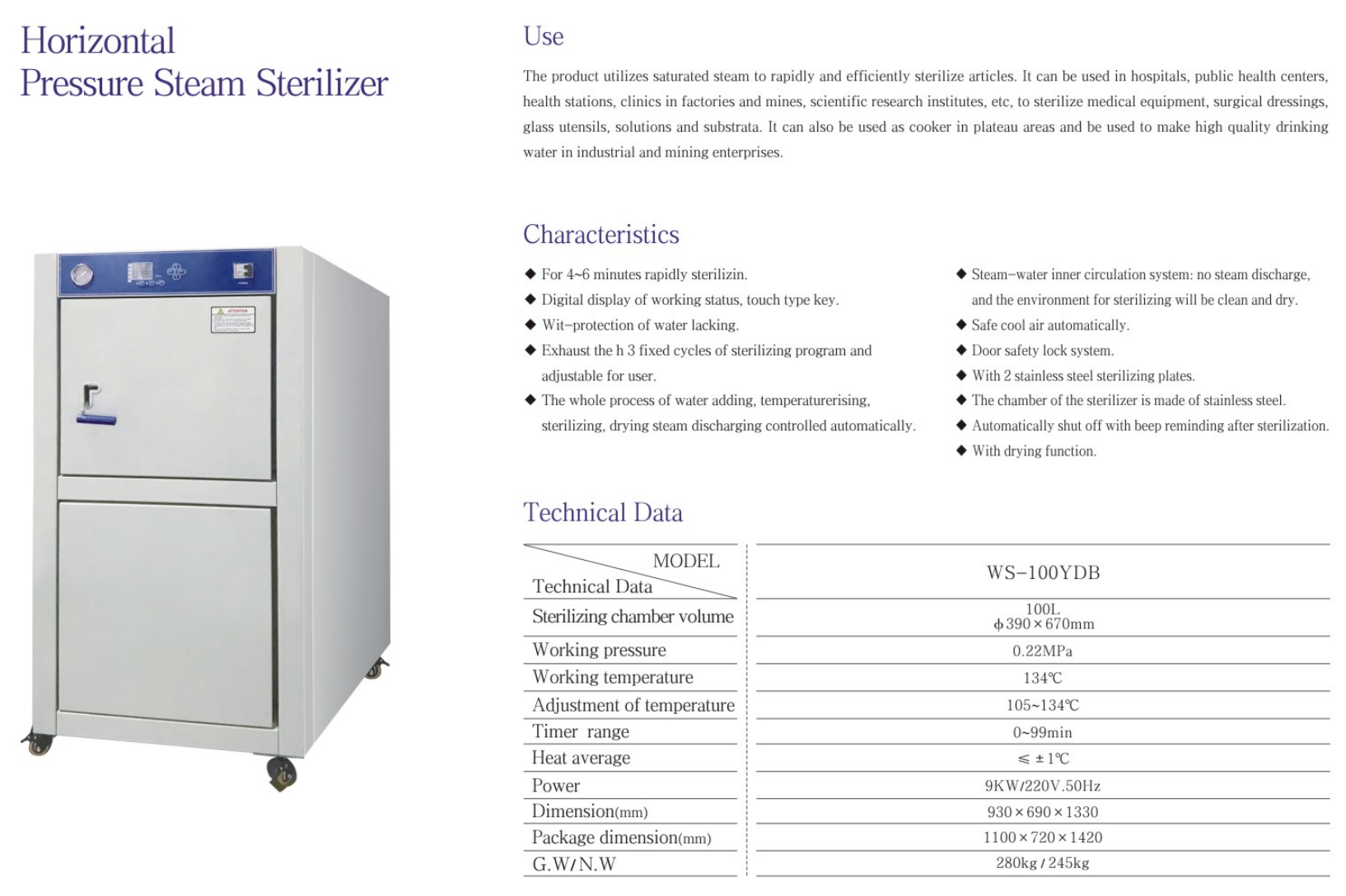 • The sterilization process is automatically controlled, without supervision, and is easy to use.
